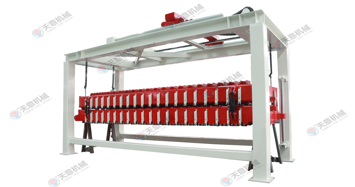 坯体经过发泡静停达到切割要求后模具转移至切割区,由翻转机分离模具并将坯体翻转90度放到蒸养小车上,然后经过切割工序对坯体进行侧面切割刨槽及水平和垂直分割,使之达到外观尺寸要求,切割工作可以机械化进行也可人工操作,这道工序直接决定ALC板材的制品外观质量以及某些内在质量。