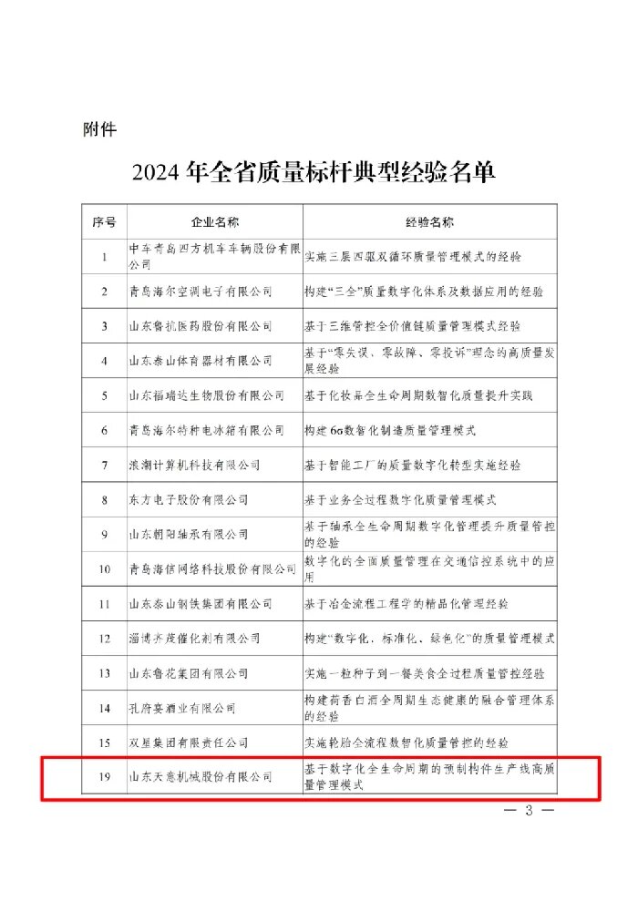 7月,山东省工业和信息化厅公布了全省质量标杆奖。天意机械凭借在关键过程质量控制方向的不懈探索,以基于数字化全生命周期的预制构件生产线高质量管理模式斩获“2024年全省质量标杆”。