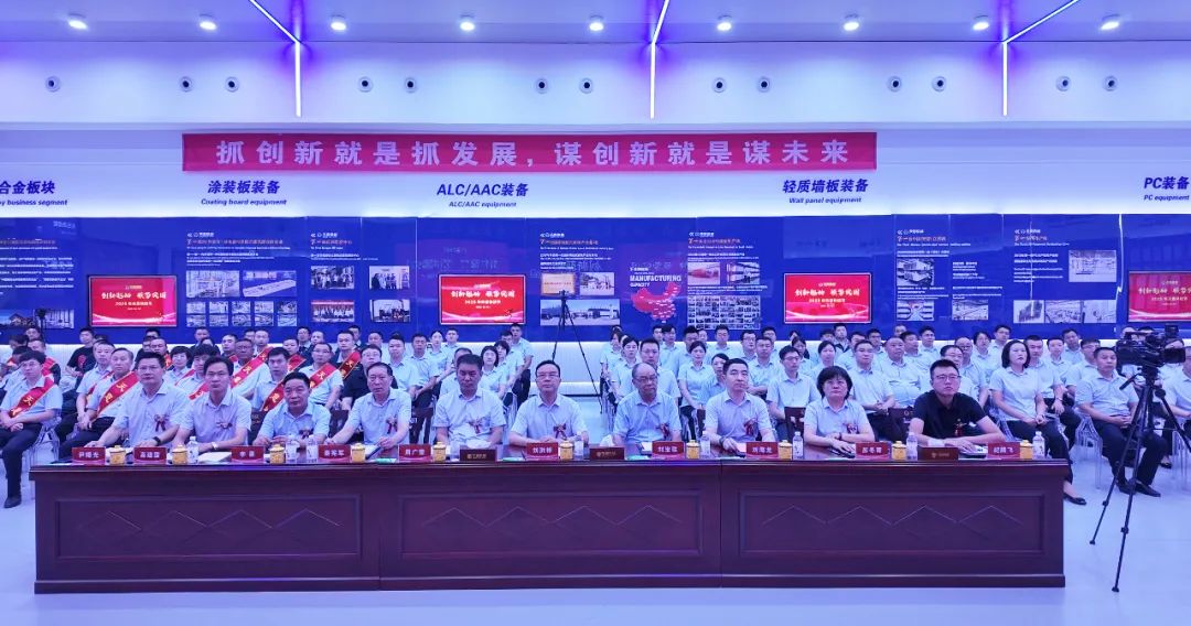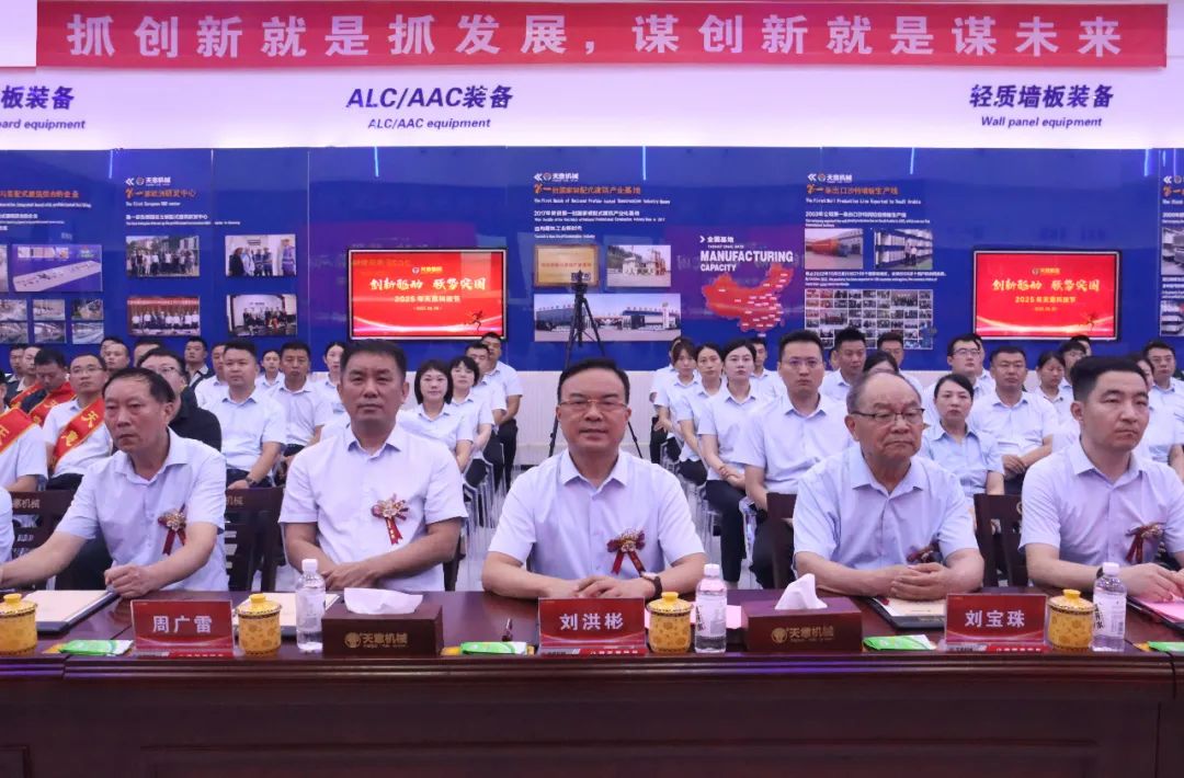 最后,集团董事长刘洪彬做集团总结及未来展望。刘总指出,天意上半年发展呈现三方面特点,第一,创新驱动:以创新为市场回暖积蓄力量。上半年,研发了模块智能化柔性生产线,为模块化房屋建造提供智能装备,研发了光伏清扫机器人,提供光伏电站清洁解决方案。天意荣获山东省五一劳动奖状,入选山东省先进级智能工厂、省级专家服务基地,卓越也建成了新的工业互联网展厅。上半年,产学研合作迈出新步伐,天意与山东大学共同举办了“天意杯”山东大学第五届智造未来创新大赛,山东交通学院党委书记王伟一行、山东建筑大学校党委常委、副校长邱立平一行来集团参观座谈,共谋发展新篇章。第二,国际市场:用中国智造点亮"一带一路"。上半年,天意参加了俄罗斯国际工程机械展、广交会、德国宝马展、汉诺威工业博览会、沙特阿拉伯利雅得五大行业展览会等重量级国际展会。塔吉克斯坦总统亲临考察的墙板项目,成为当地绿色建筑的示范工程。与俄罗斯客户签订了ALC和PC大单。这些突破不仅带来了42%的出口增长,更让中国建材高端装备赢得了世界尊重。第三,强势突围:三大引擎驱动未来发展。在巩固装配式建筑装备主业的同时,培育了三大新增长极,分别是光伏清扫机器人(已具备智能导航、自主清洁、高效节能等特点)、智慧物流(目前已有京东、拼多多、好想来等大型企业入驻)、新能源业务板块(天意已实现了80%的绿电生产,正在搭建离网储能系统,未来还将建设微电网和虚拟电厂)。