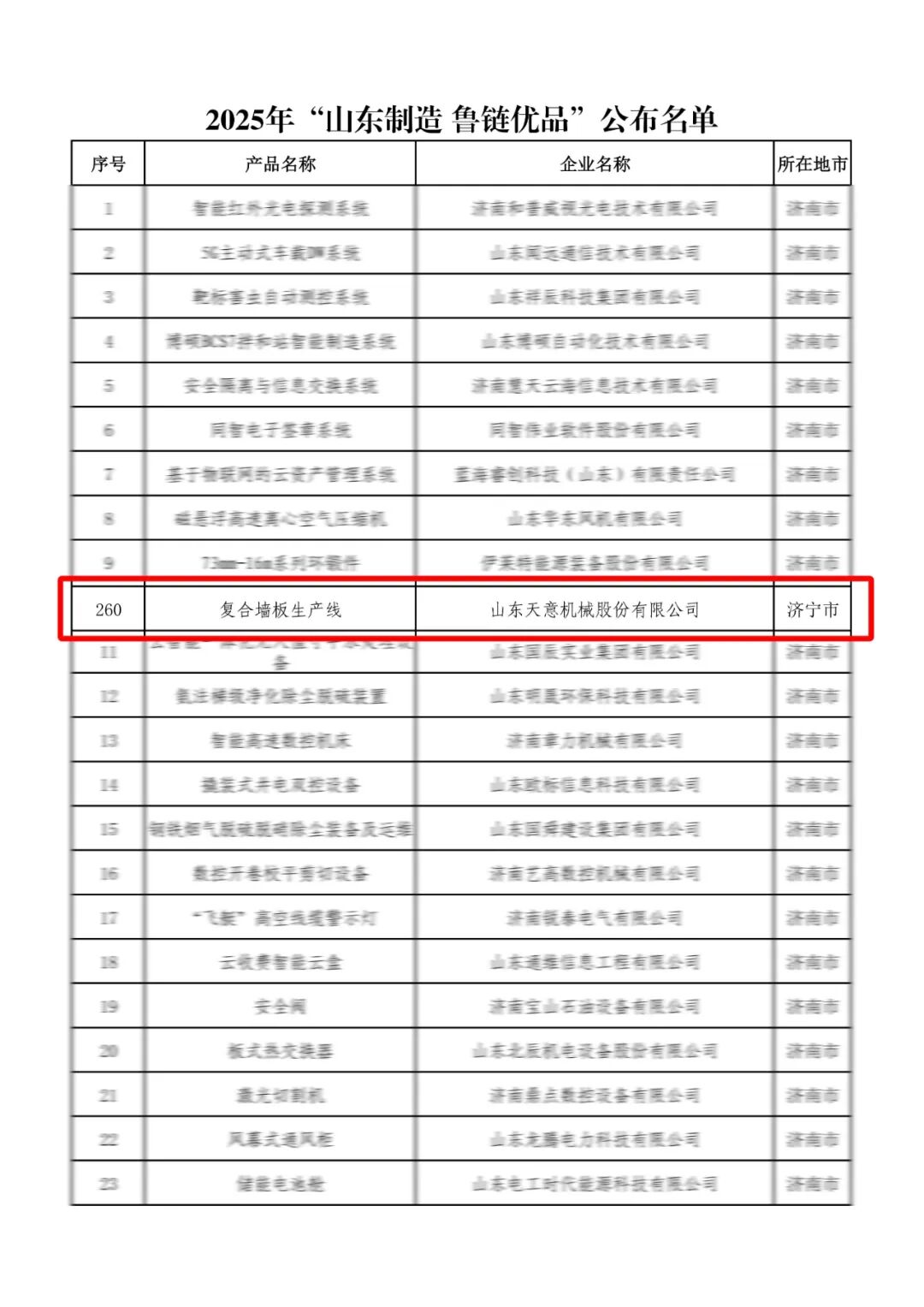 近日,山东省工业和信息化厅公布“山东制造·鲁链优品”品牌名单,山东天意机械股份有限公司自主研发的复合墙板生产线成功入选,标志着公司在绿色建材装备领域的创新实力与产业链引领地位再获权威认可。 “山东制造·鲁链优品”评选旨在聚焦省内优势产业链,培育一批质量卓越、技术领先、管理精细的标杆产品与企业。天意机械凭借在装配式建筑装备领域的持续深耕,其复合墙板生产线以高度自动化、节能环保、稳定高效等特点脱颖而出,成为推动建筑产业现代化的重要力量。