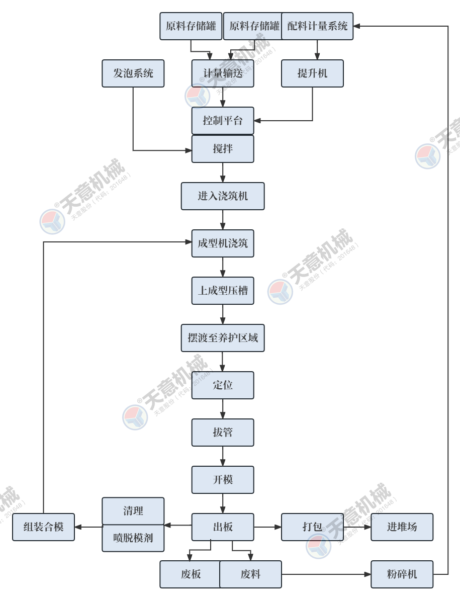 1.采用水泥发泡墙板专用5立方双螺带式高速搅拌机,有效容积为3.5立方,搅拌均匀,搅拌速度快(发泡完成后60秒内可将泡沫和料浆搅拌均匀),整体搅拌周期6-8分钟/次,单次搅拌可浇筑一台20块墙板机,双宽螺带式设计,可有效的降低泡沫破损率。