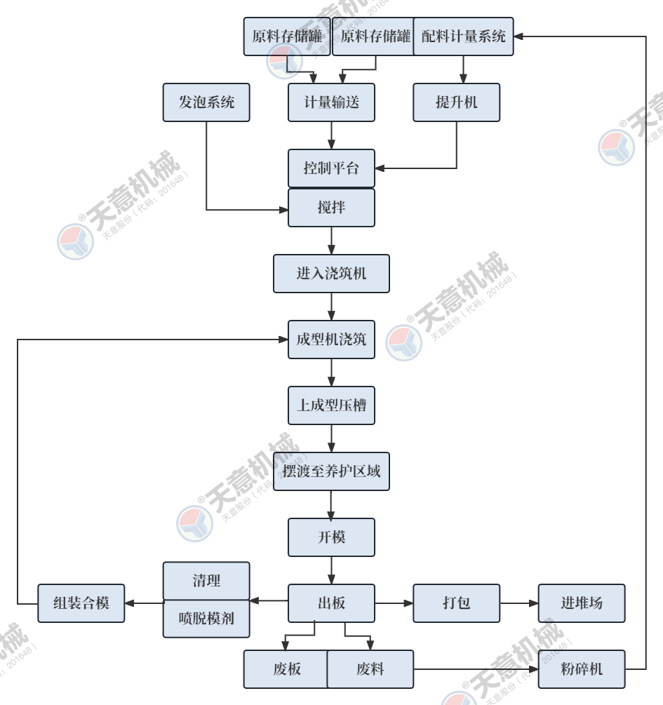 TYF-16A型复合墙板生产线是公司综合国内外技术经验,开发研制的新型墙体板材生产线。复合墙板生产线主要分为配料系统、搅拌系统、发泡系统、数控配电系统、墙板成型系统、料浆泵送系统、EPS预发系统、液压循环系统、整体出板系统。